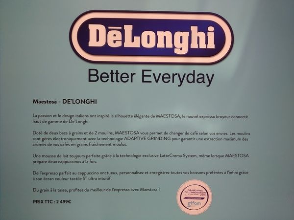 Il a été attribué à la cafetière expresso connectée DéLonghi Maestosa avec double broyeur à grains intégré, technologie Adaptative Grinding et technologie LatteCrema System qui permettent de faire de nombreuses boissons facilement via son écran tactile ou l'application smartphone.