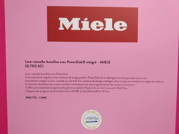 (roulement de tambours) La médaille d'or du Grand Prix de l'Innovation 2019 est attribuée au lave-vaisselle Miele Auto-Dos PowerDisk, il est doté d'un système intelligent de dosage en fonction du type de vaisselle et du degré de salissure pour adapter le produit lavant en fonction des besoins.