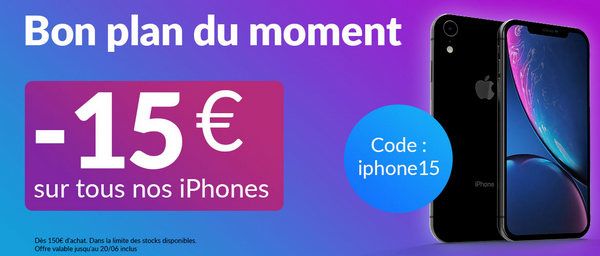 15€ de réduction pour l'achat d'un iPhone reconditionné dès 150€ d'achat avec le code iphone15