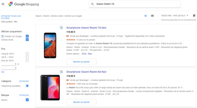 Nous avons testé avec une recherche pour le smartphone Xiaomi Redmi 7A et chez "Acheter sur Google" l'enseigne la moins chère c'est Boulanger qui le vend au tarif de 119.90€ mais il est disponible via le comparateur de prix intégré sur de nombreuses market-places à partir de 76.44€.