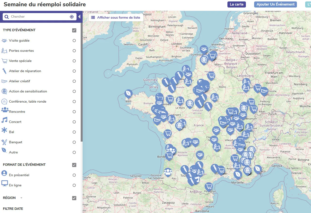 Cet outil permet de localiser facilement toutes les structures participantes sur l'ensemble du territoire. En quelques clics, chacun peut identifier les ateliers, magasins solidaires ou associations proches de son domicile et leur rendre visite pour les rencontrer et découvrir leur travail. Elles vous proposeront des visites guidées, des ateliers de réparation ou des ventes exceptionnelles.