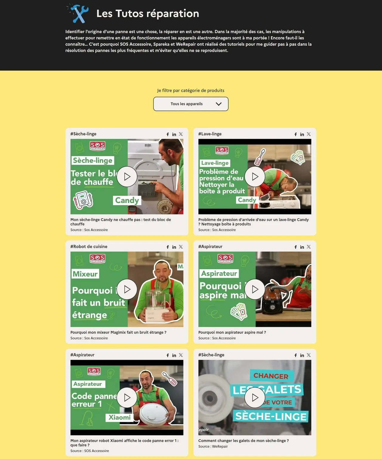 Chaque vidéo est présentée avec un titre explicite : « mon sèche-linge ne chauffe pas : test du bloc de chauffe », « pourquoi mon mixeur fait un bruit étrange ? », etc... Un aperçu visuel, le nom du partenaire à l’origine du contenu et des hashtags permettent de trier rapidement les tutoriels (#LaveLinge, #RobotCuisine, etc...).
