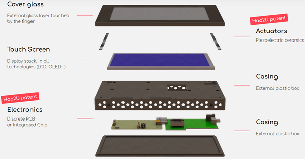 La start-up française Hap2U est spécialisée dans la technologie haptique, alors déjà qu'est-ce que c'est que ça ? La technologie haptique permet de ressentir au toucher des sensations à travers des surfaces planes : verre, bois, métal, plastique, etc... En créant de micro-vibrations à l'endroit où les doigts touchent la surface équipée de cette technologie.