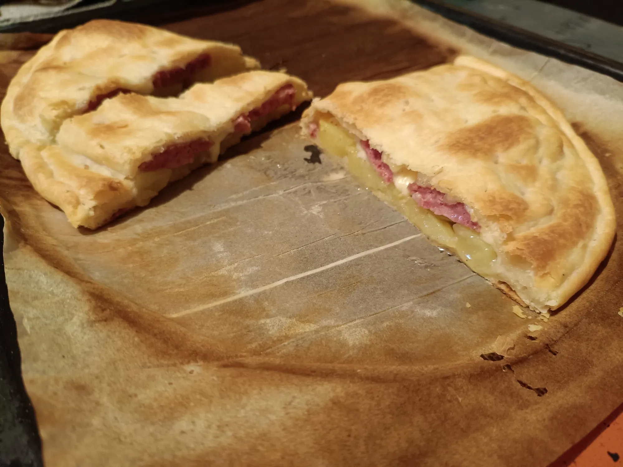 Préparation : étaler la pâte et en garnir la moitié avec les restes du repas de la veille, assaisonnez et repliez la pâte par dessus pour former un chausson. Percez quelques trous en surface et cuire au four 30 minutes à 200°C.