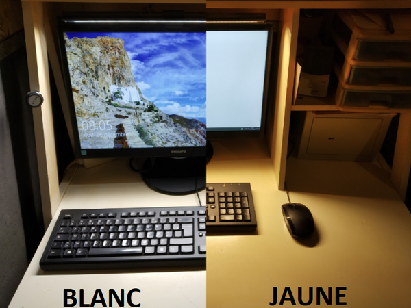 Celles là sont soit jaunes soit orangées alternées donc en effet elles doivent émettre moins de lumière bleue que les leds blanches classiques, deuxième élément c'est que la barre lumineuse orientée vers le bas fait une sorte de filtre naturel qui semble diminuer l'effet des lumières bleues émanant de l'écran.