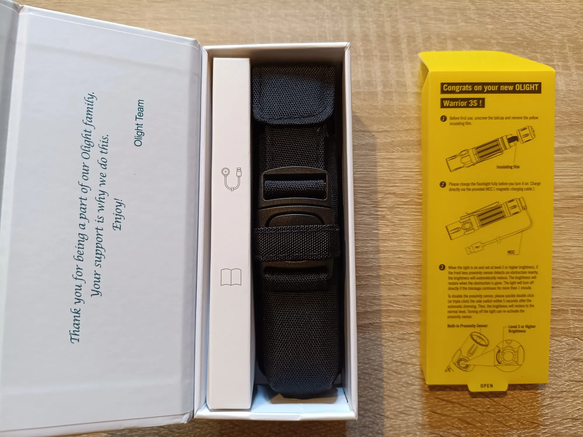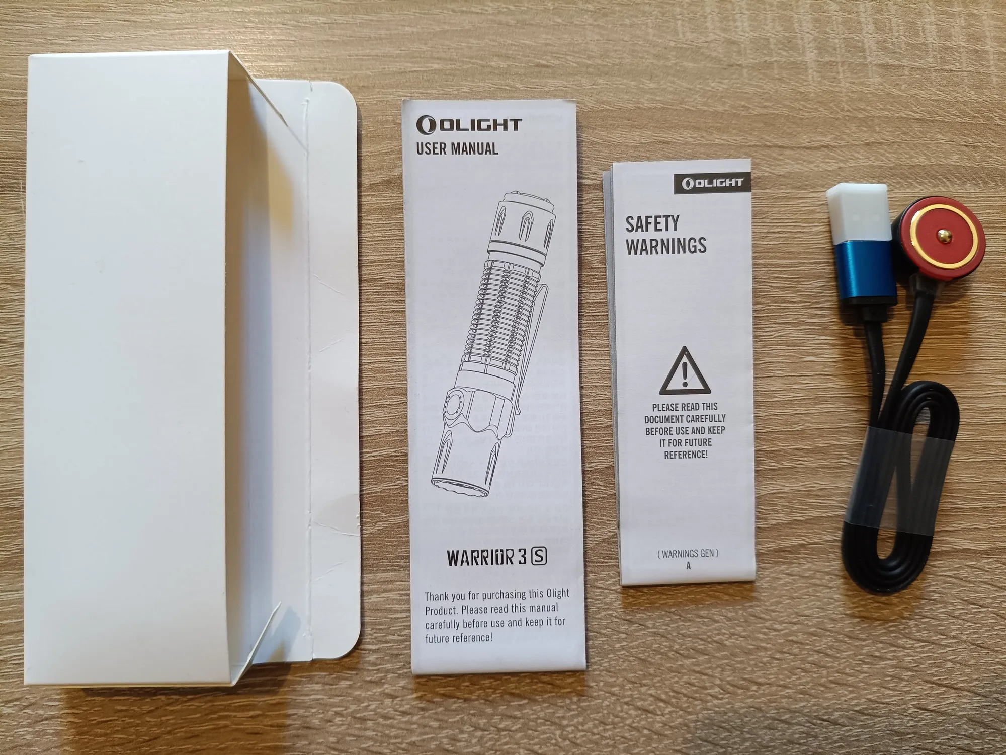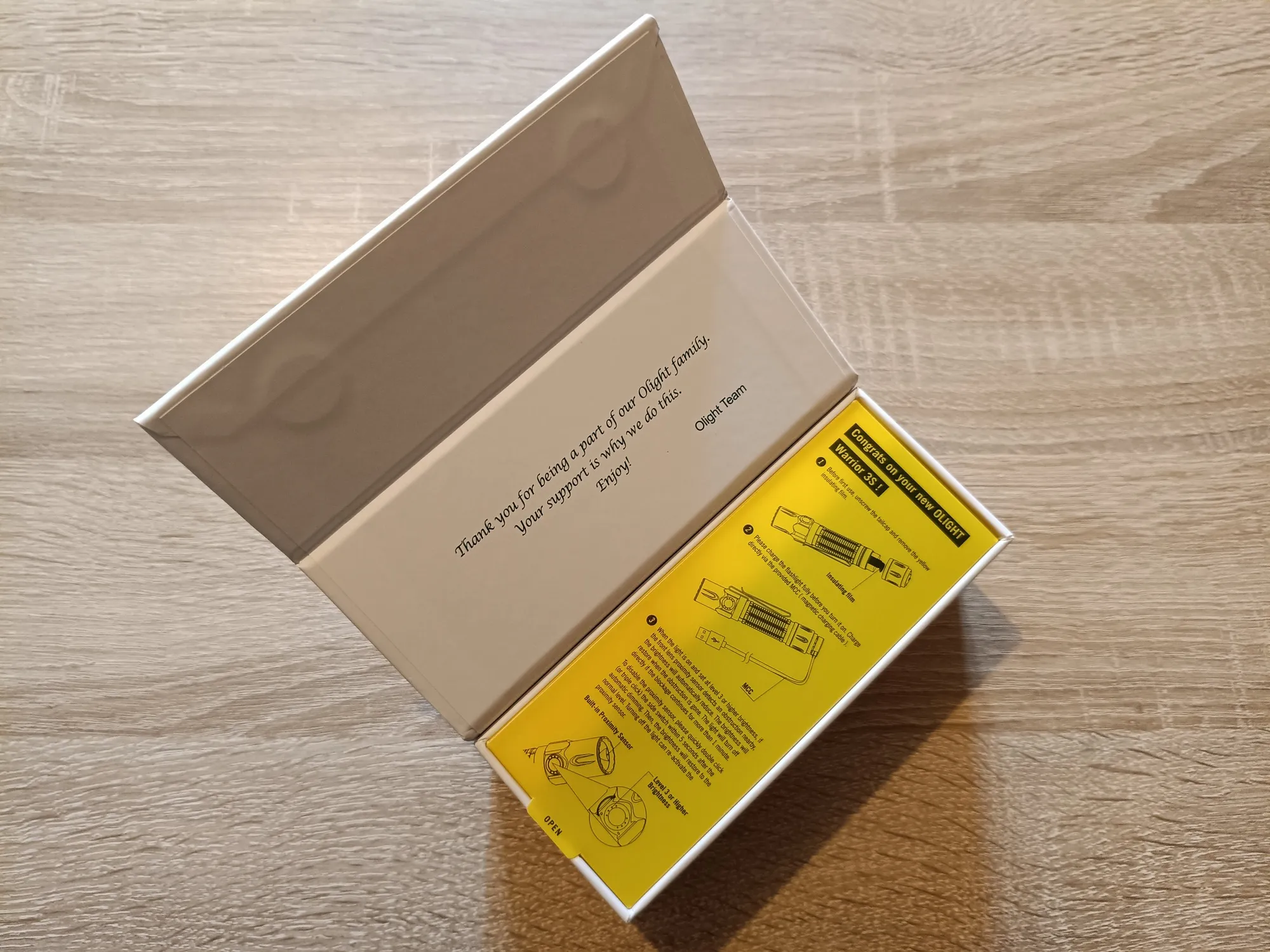 La lampe de poche Olight Warrior 3S est conditionnée dans une petite boite en carton, joliment habillé comme c'est toujours le cas des produits de la petite marque spécialisée. À l'intérieur elle est présentée dans son étui, les documents et accessoires sont eux dans une petite boite à côté.