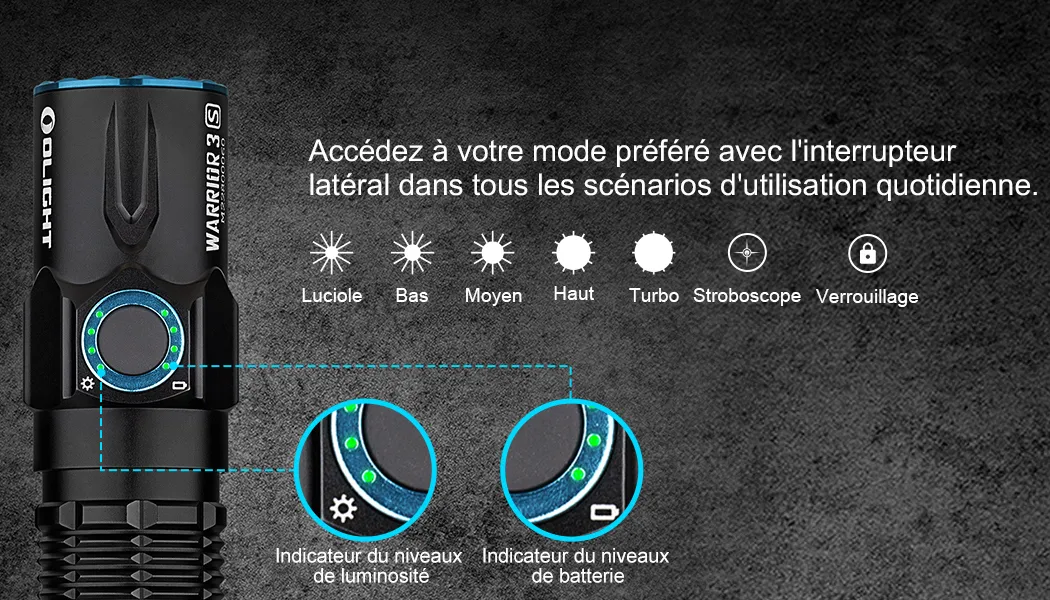 Pour changer de mode il faut faire soit des appuis courts, soit des appuis longs. Un clic unique active les modes classiques : luciole, faible, classique ou haut et vous passez de l'un à l'autre en faisant un appui long (boucle). Un double clic active le mode Turbo et un triple clic active le mode Stroboscope. Dans tous les cas, il suffit d'un simple clic pour éteindre la lampe.
