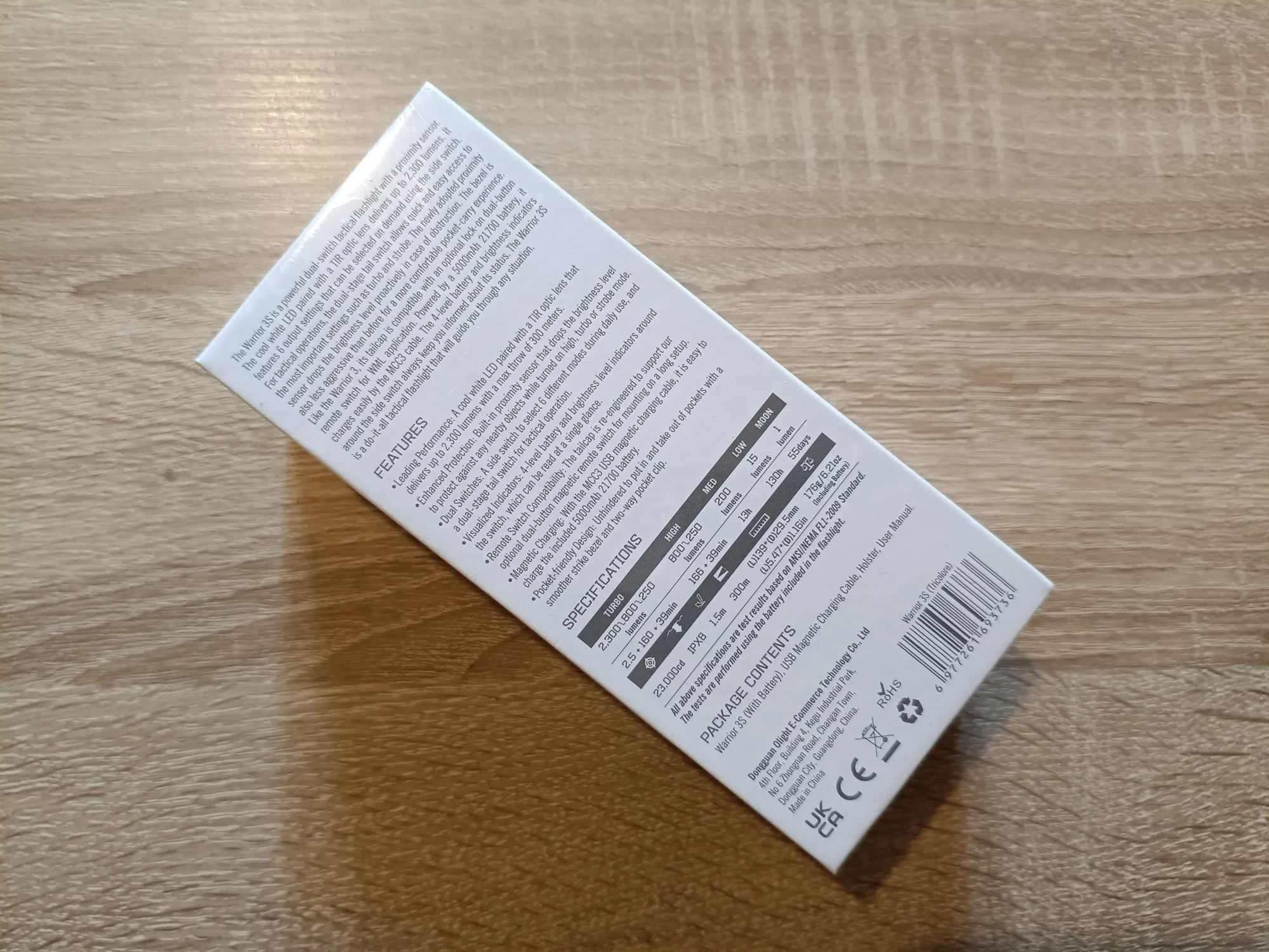 L'emballage est donc de taille adaptée et assez simple, sans plastique ce qui est à noter et entièrement recyclable. Vous avez donc une lampe dans son étui, un câble USB pour la charger et deux documents : un mode d'emploi (traduit en français) et un autre pour rappeler les consignes de sécurité, ça ne sert pas à grand chose mais est obligatoire.