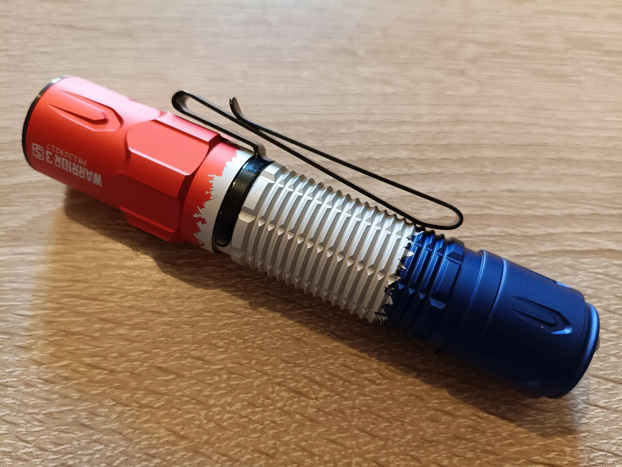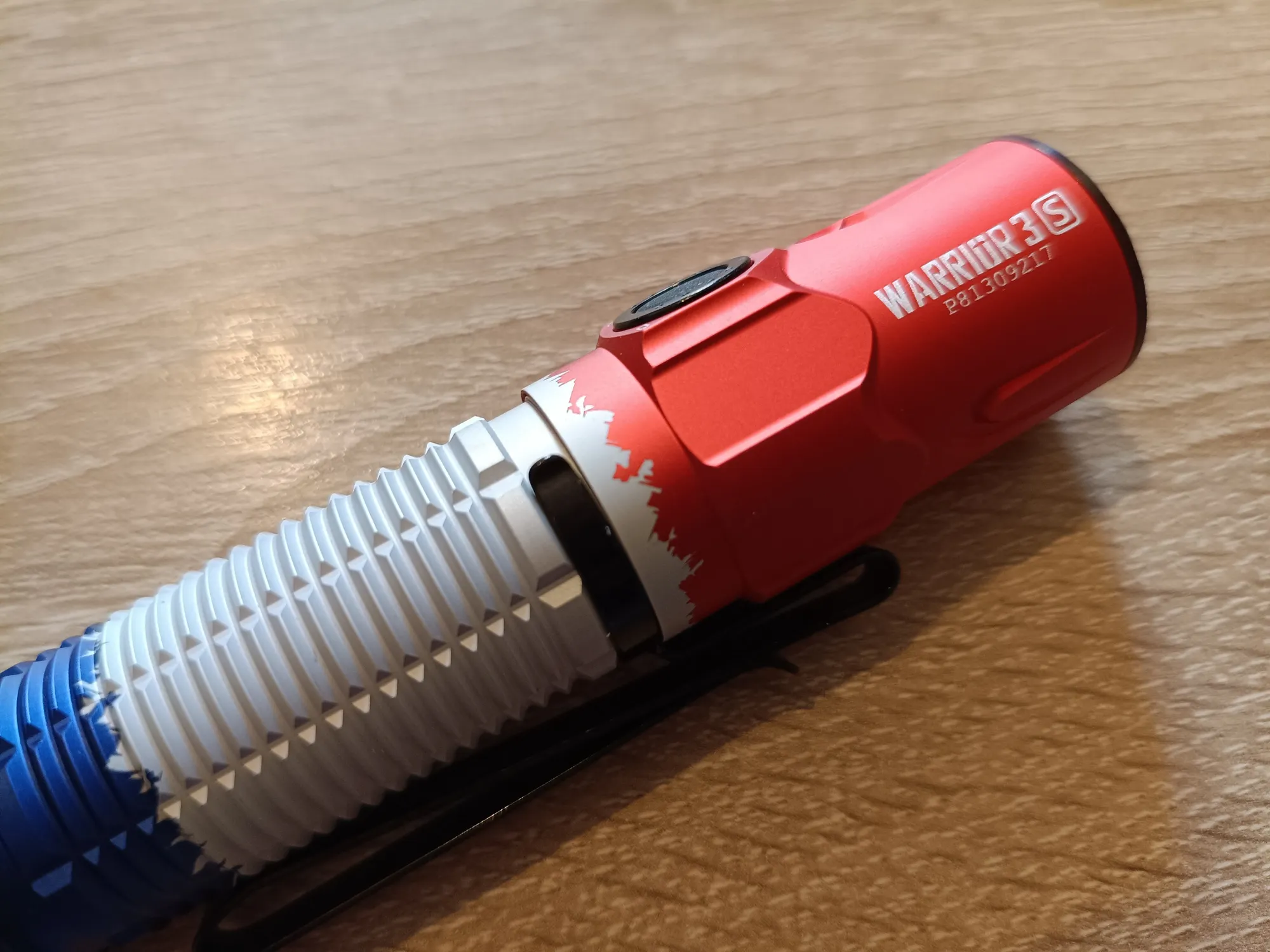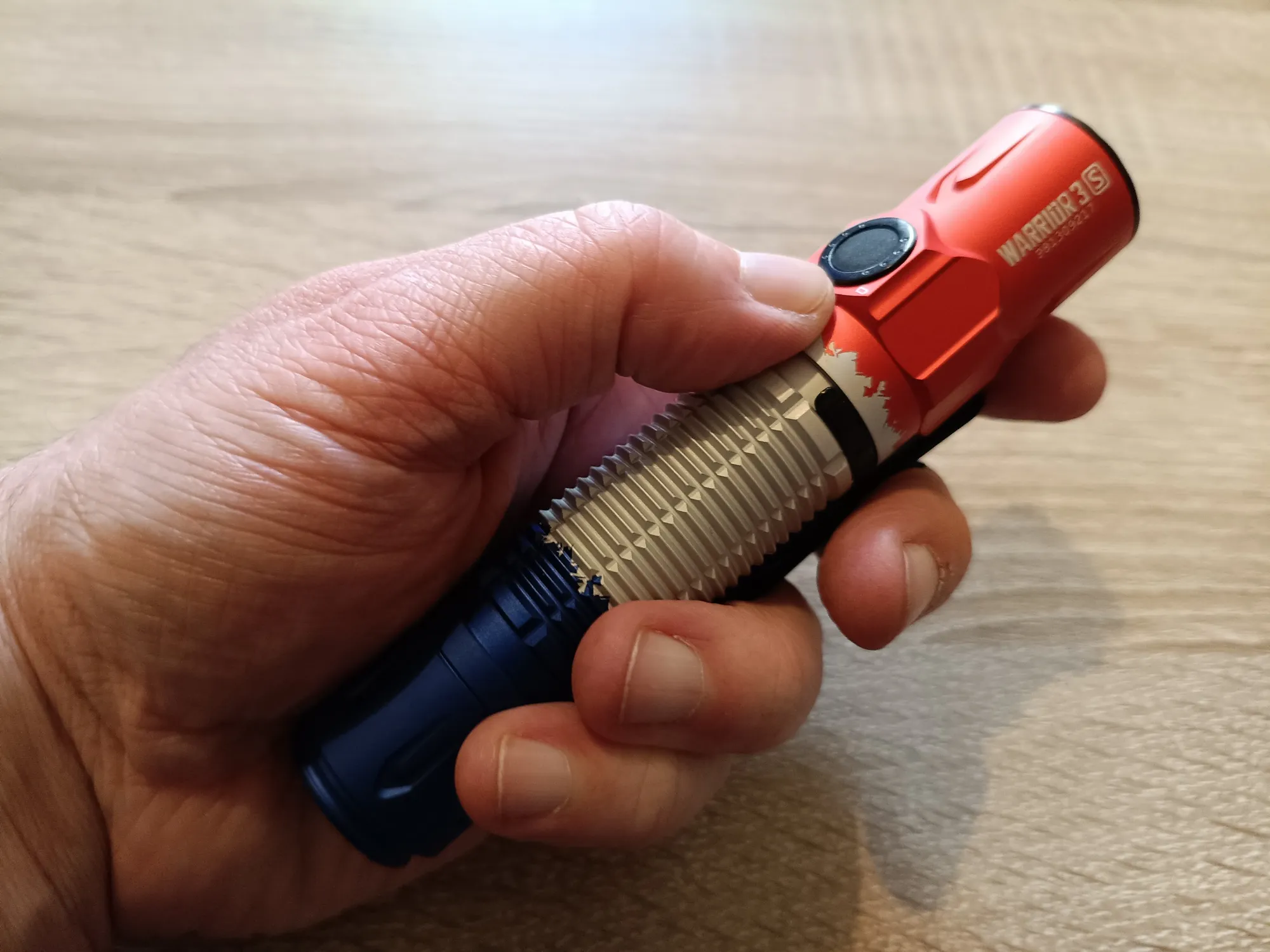 La Olight Warrior 3S est une lampe de poche au format classique qui ne paye pas de mine, même si on voit bien que son boîtier est joliment travaillé, d'autant plus dans cette version tricolore. Mais en y regardant d'un peu plus près, on comprend vite qu'elle n'est pas comme les autres.