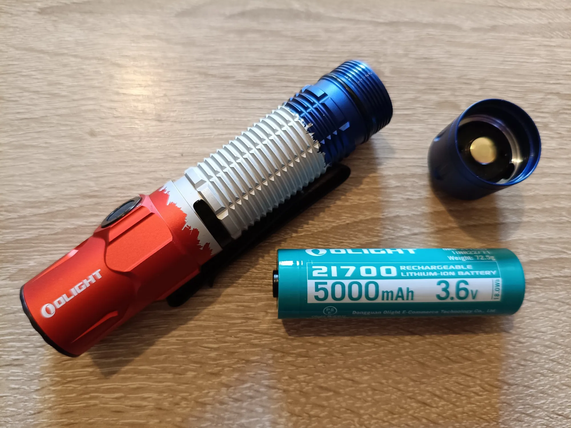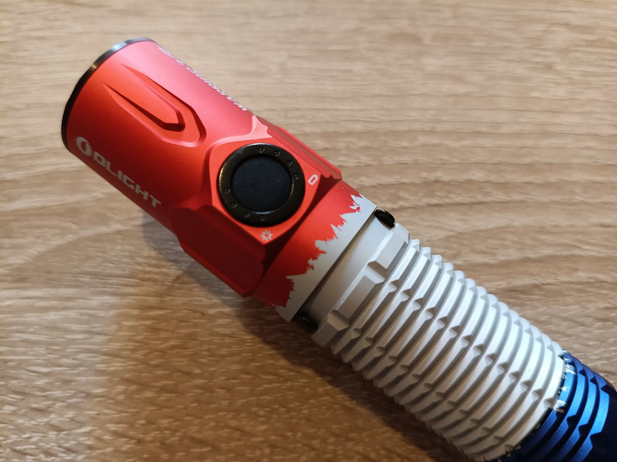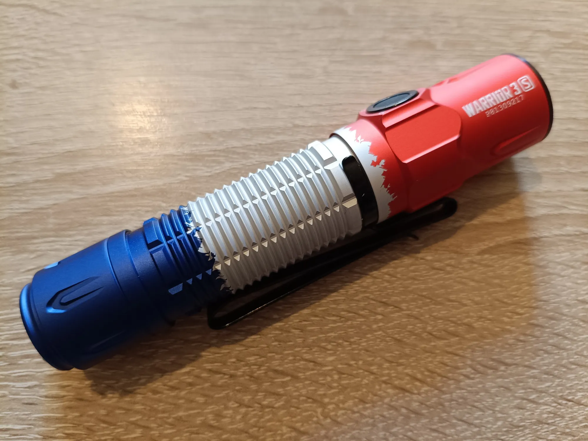 La Olight Warrior 3S est une lampe de poche au format classique qui ne paye pas de mine, même si on voit bien que son boîtier est joliment travaillé, d'autant plus dans cette version tricolore. Mais en y regardant d'un peu plus près, on comprend vite qu'elle n'est pas comme les autres.