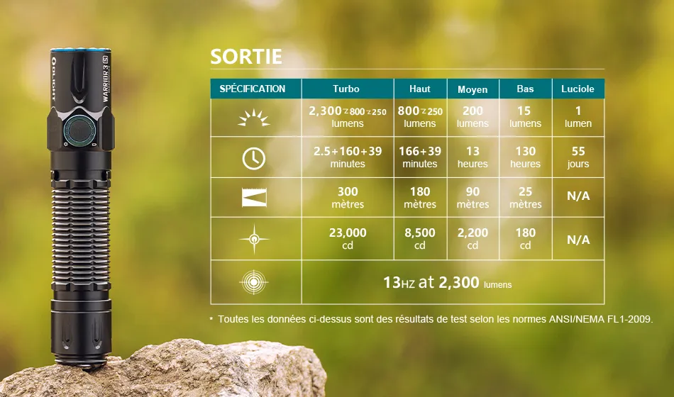 En choisissant la Olight Warrior 3S vous recevez une lampe de poche compacte mais surpuissante, car 2.300 Lumens ça représente une luminosité supérieure à deux ampoules classiques de 100 Watts, dirigées dans un faisceau et non pas diffusée à 360°.
