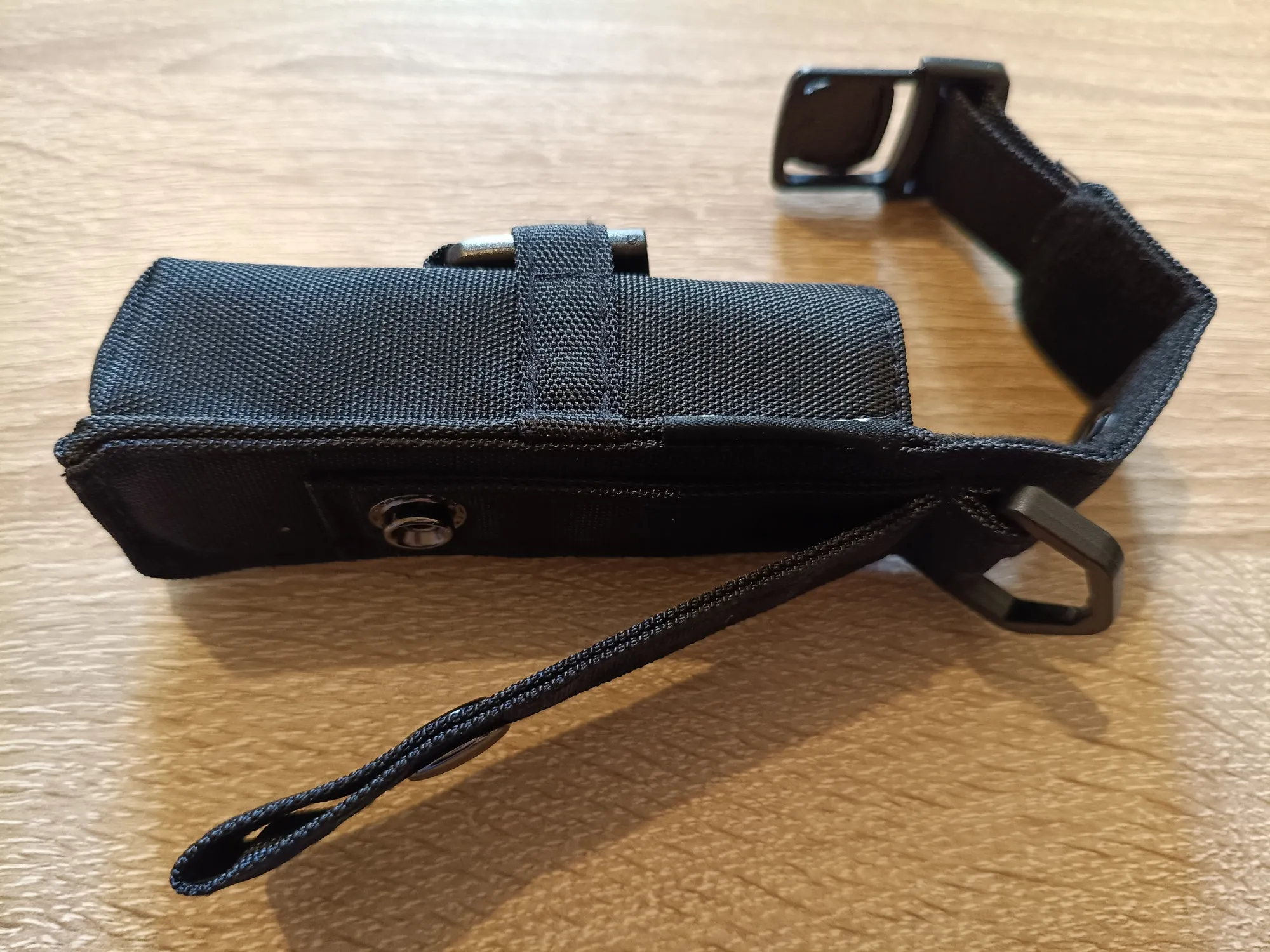 La lampe est livrée dans un étui assez imposant, qui la protège parfaitement et permet de la transporter. Il est en nylon tressé, avec un clip pour ouvrir et fermer l'étui. À l'arrière sont disposés deux éléments pour l'accrocher et l'avoir à portée de main : un passage pour ceinture avec bouton pression et une petite anse pour la suspendre.