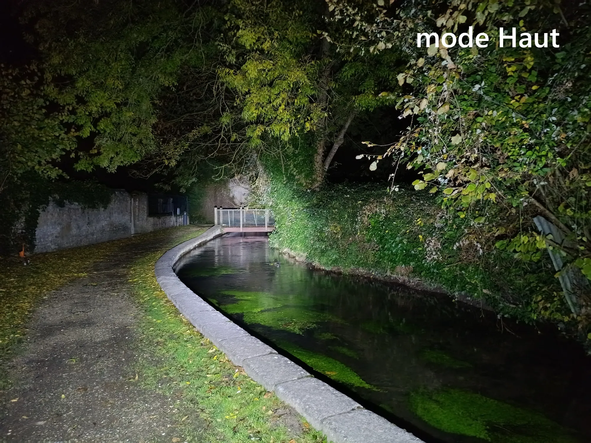 C'est d'ailleurs là qu'elle diffère des lampes de poche classiques qui ont une intensité fixe, ce qui est aussi le cas sur les trois modes d'éclairage classiques. En intensité moyenne à 200 Lumens (équivalent 20 Watts) elle dispose d'une autonomie de 13 heures, mais à 2.300 Lumens elle serait de moins d'une heure.