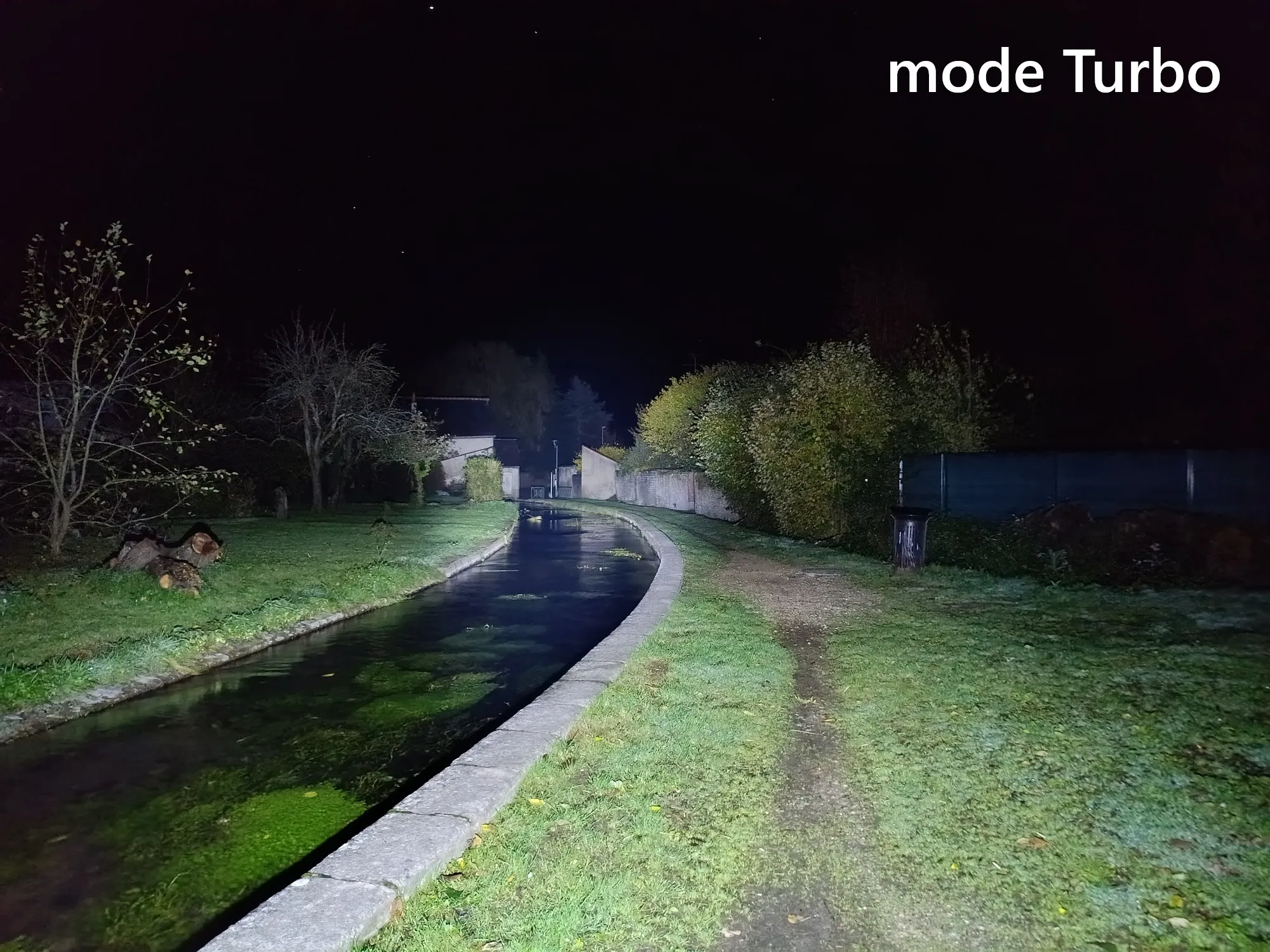 Mode Turbo : 2.300 Lumens pendant 3 minutes, puis 648 Lumens (160 minutes), puis 250 Lumens (39 minutes)